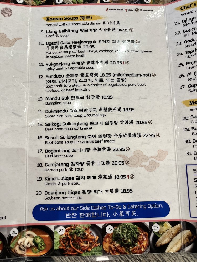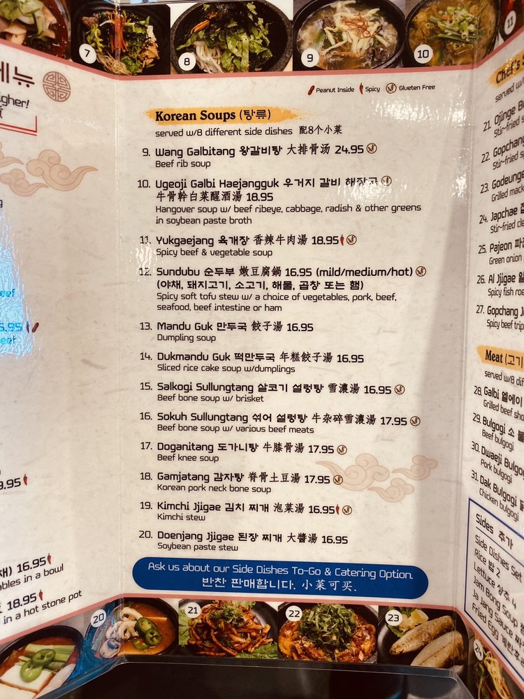 Mild mediumhotspicy soft tofu stew w a choice of vegetables, pork, beef, seafood, beef intestine or ham